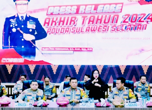 Diakhir tahun 2024, Kapolda Sulawesi Selatan Irjen Pol Yudhiawan bersama pejabat utama Polda, menggelar press release terkait capaian kinerja dan prestasi, berlangsung di Aula Mappaodang Marpolda Jalan Perintis Kemerdekaan, Senin (30/12/2024). Dipaparkan, kinerja Polda Sulsel mengalami peningkatan pada tahun 2024.