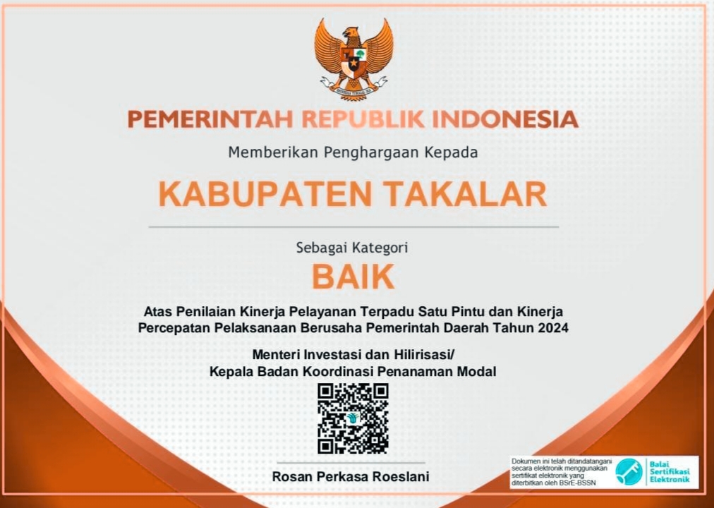 Dari Penilaian tersebut, Kabupaten Takalar mendapat penghargaan sebagai Kategori Baik Atas Penilaian Kinerja Pelayanan Terpadu Satu Pintu dan Kinerja Percepatan Pelaksanaan Berusaha Pemerintah Daerah Tahun 2024.