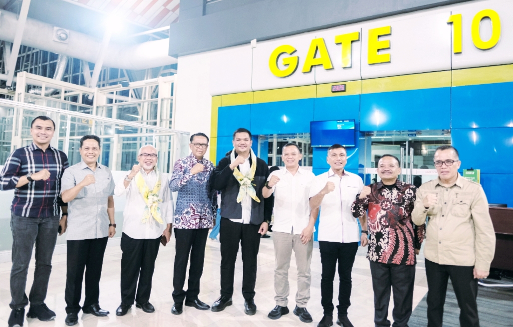 Bupati Bantaeng dan Wakil Bupati Bantaeng, M Fathul Fauzy Nurdin dan Sahabuddin (Uji-Sah) tiba di Bandar Udara Internasional Sultan Hasanuddin, Jumat, 28 Februari 2025.