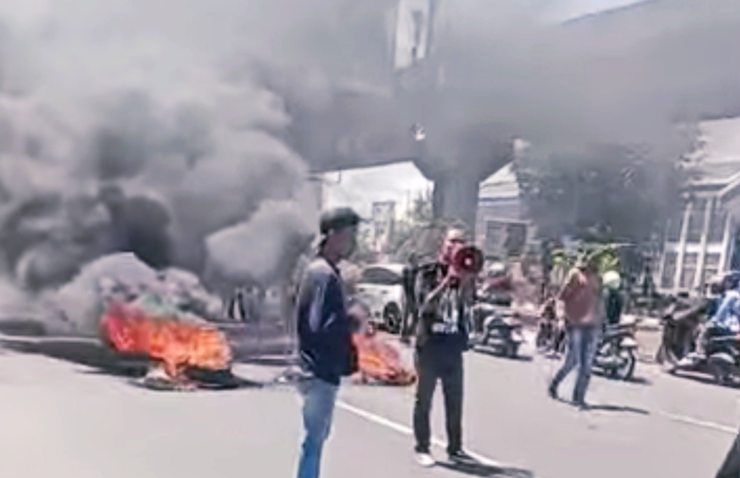 Di lokasi ini, para demonstran dari berbagai elemen silih berganti berorasi sembari membakar ban dan menguasai tiga lajur yang memicu kemacetan.