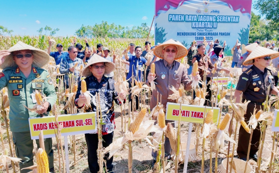 Wakil Bupati Takalar Dr. H. Hengky Yasin,.S.Sos,.MM bersama dua Jendral Bintang Dua yaitu Irjen Rusdi Hartono Kapolda Sulsel dan Mayjen TNI Windiyatno Pangdam XIV Hasanuddin ikut melakukan Panen Raya Jagung serentak se-Indonesia, Kamis (5/6/2025).