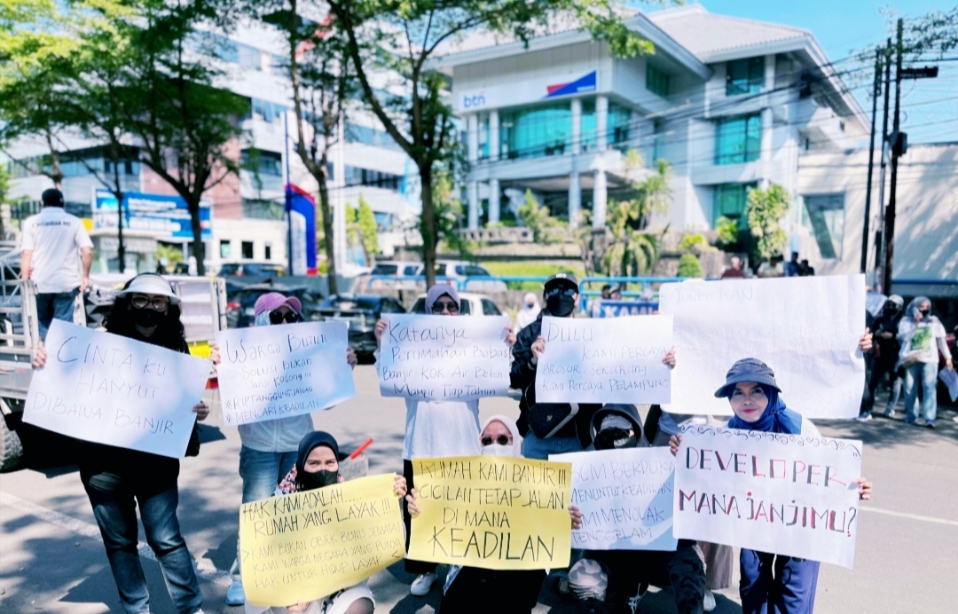 Massa pendemo, menuntut tanggungjawab Developer untuk mengembalikan uang pembelian rumah hingga kompensasi angsuran dengan cara KPR-nya dipotong oleh pihak Bank BTN dan yang lainnya.