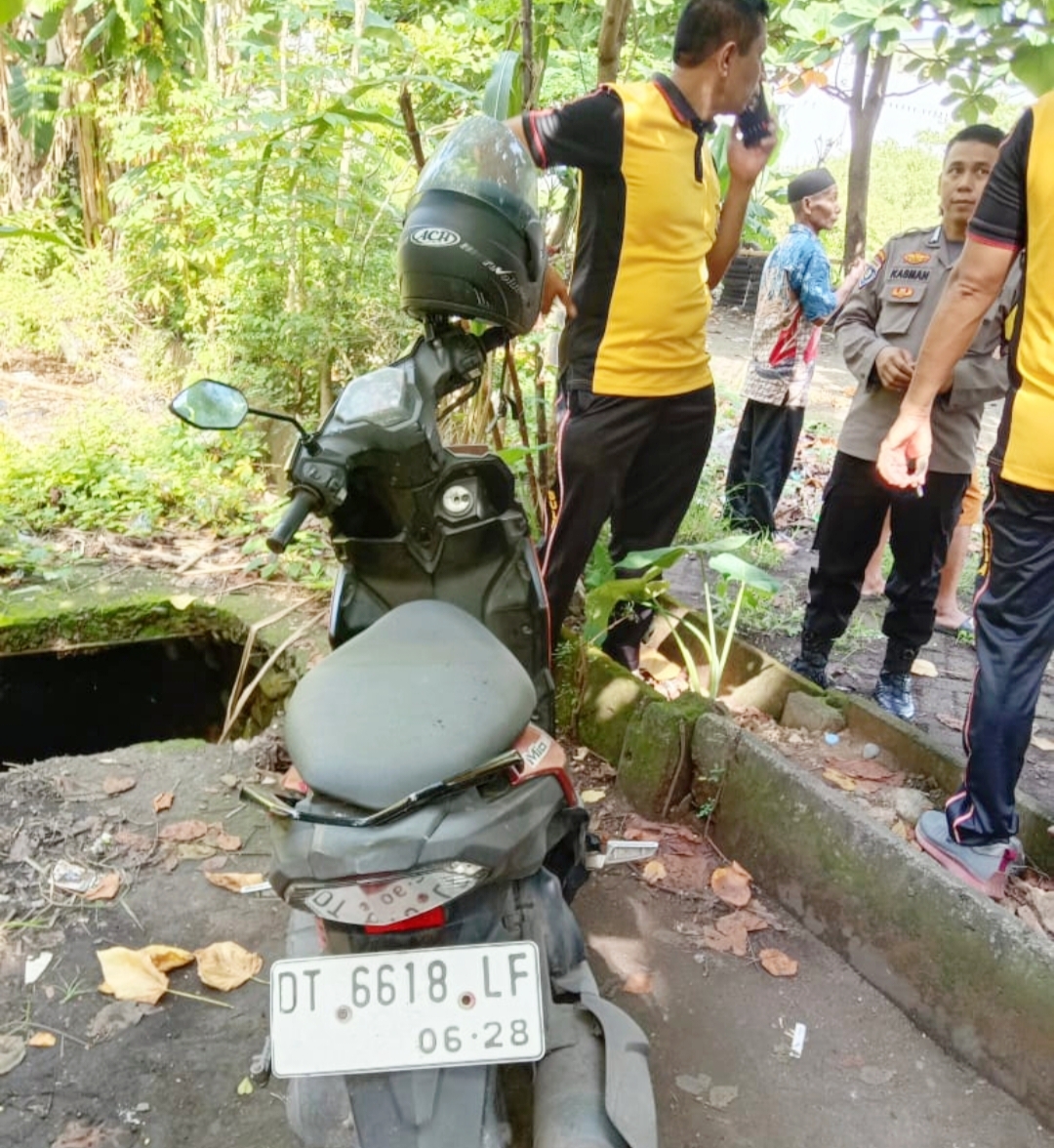 Di seputar lokasi mayat pria itu, terparkir sebuah sepeda motor dengan nomor polisi DT.6618 LF dan helm standar ACH warna hitam.