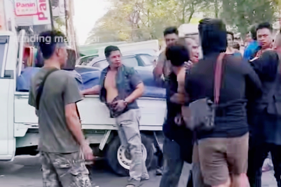 Ada yang berupaya melerai dan ada pula apatis melihat drama adu jotos sang preman versus pedagang sayur itu.