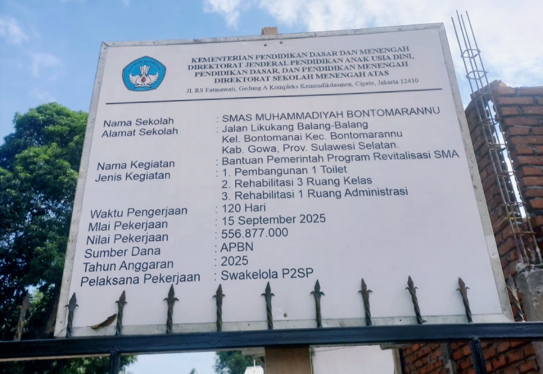 Pembangunan SMAS Muhammadiyah Bontomarannu yang bersumber dari APBN TAHUN 2025 dengan nilai pekerjaan sebesar Rp 556.877.000, dikerjakan oleh P2SP, terindikasi korupsi.