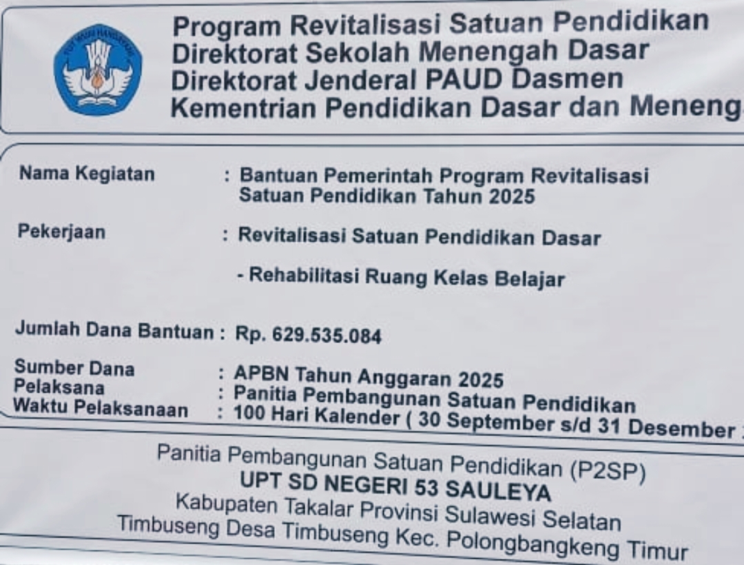 Proyek revitalisasi satuan pendidikan di UPT SD Negeri 53 Sauleya Desa Timbuseng Kecamatan Polongbangkeng Timur Kabupaten Takalar, menjadi sorotan publik karena diduga bermasalah.
