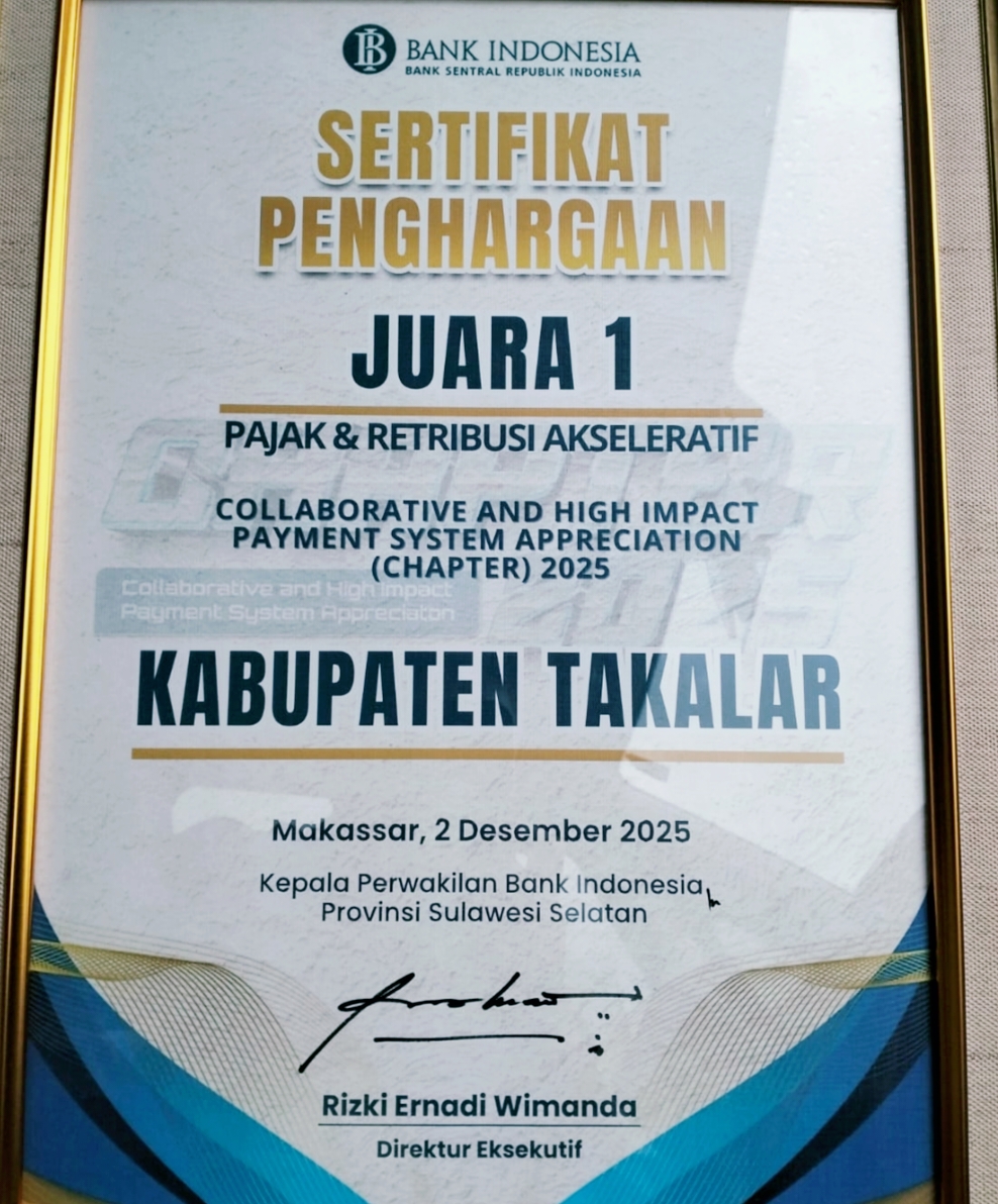 Dengan konsistensi tersebut Pemerintah Kab. Takalar melalui Badan Pendapatan Daerah Kab. Takalar meraih *Juara 1 pada Lomba Pajak & Retribusi Akseleratif yang dilaksanakan oleh Bank Indonesia (BI), berlangsung di Hotel Claro Makassar, Selasa (2/12/2025).