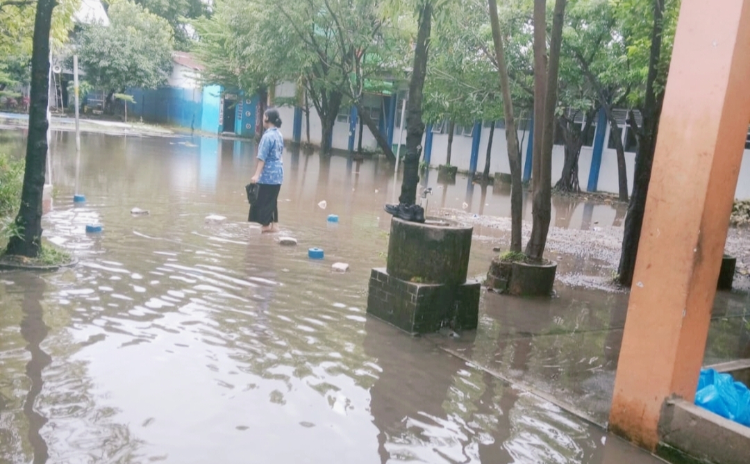 Pasalnya, dengan intensitas hujan yang tinggi membuat area atau pelataran sekolah tergenang air mencapai 20 hingga 30 cm.