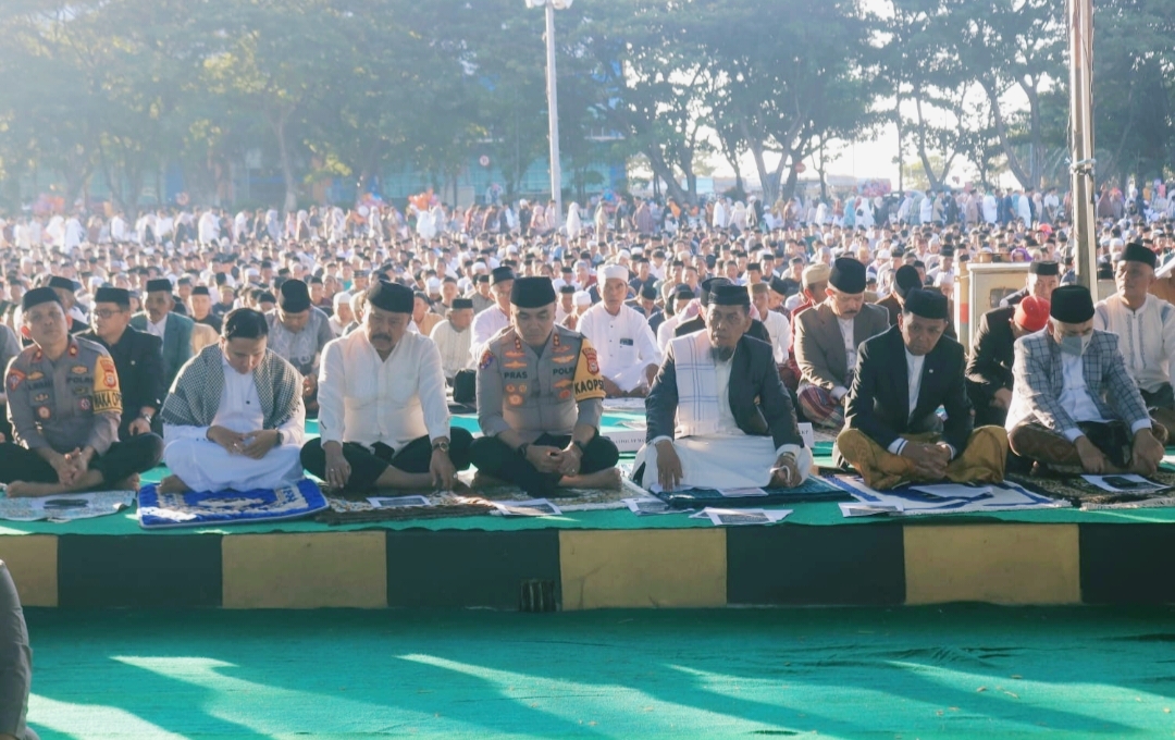 Bupati Bantaeng, M. Fathul Fauzy Nurdin, menunaikan sholat Idul Fitri 1447 H/2026 M, di Lapangan Pantai Seruni, Kabupaten Bantaeng, Sabtu (21/3).