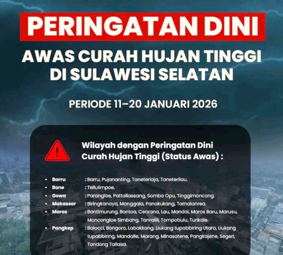Cuaca yang terus memburuk, terutama curah hujan yang meninggi disertai angin kencang, membuat Balai Besar Meteorologi, Klimatologi dan Geofisika (BMKG) Wilayah IV Makassar Sulsel mengeluarkan peringatan dini cuaca untuk periode 11–20 Januari 2026.