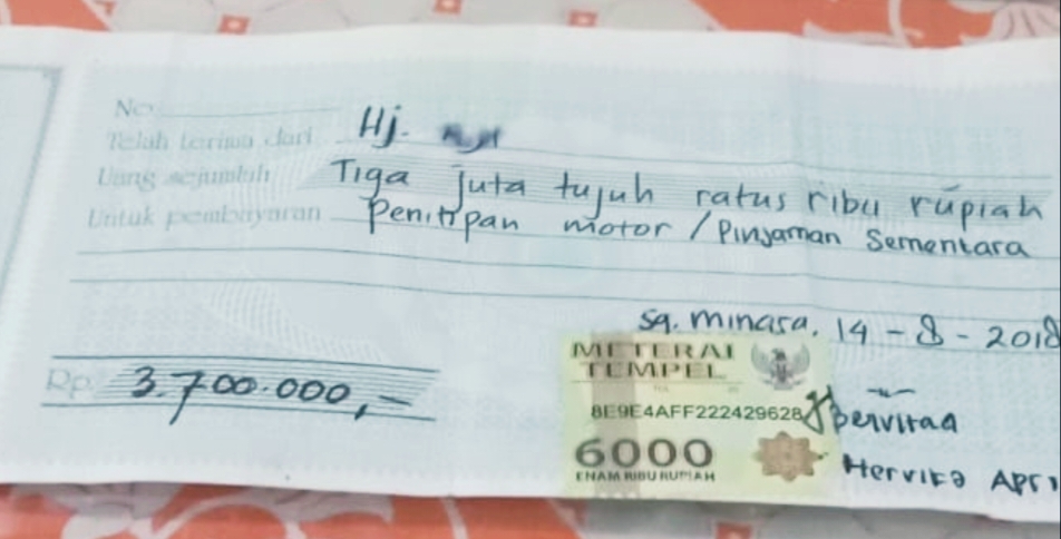 Pinjaman uang tersebut, dituangkan resmi dalam sebuah kuitansi bermaterai lengkap tandatangan Hervita, tertanggal 14 Agustus 2018.